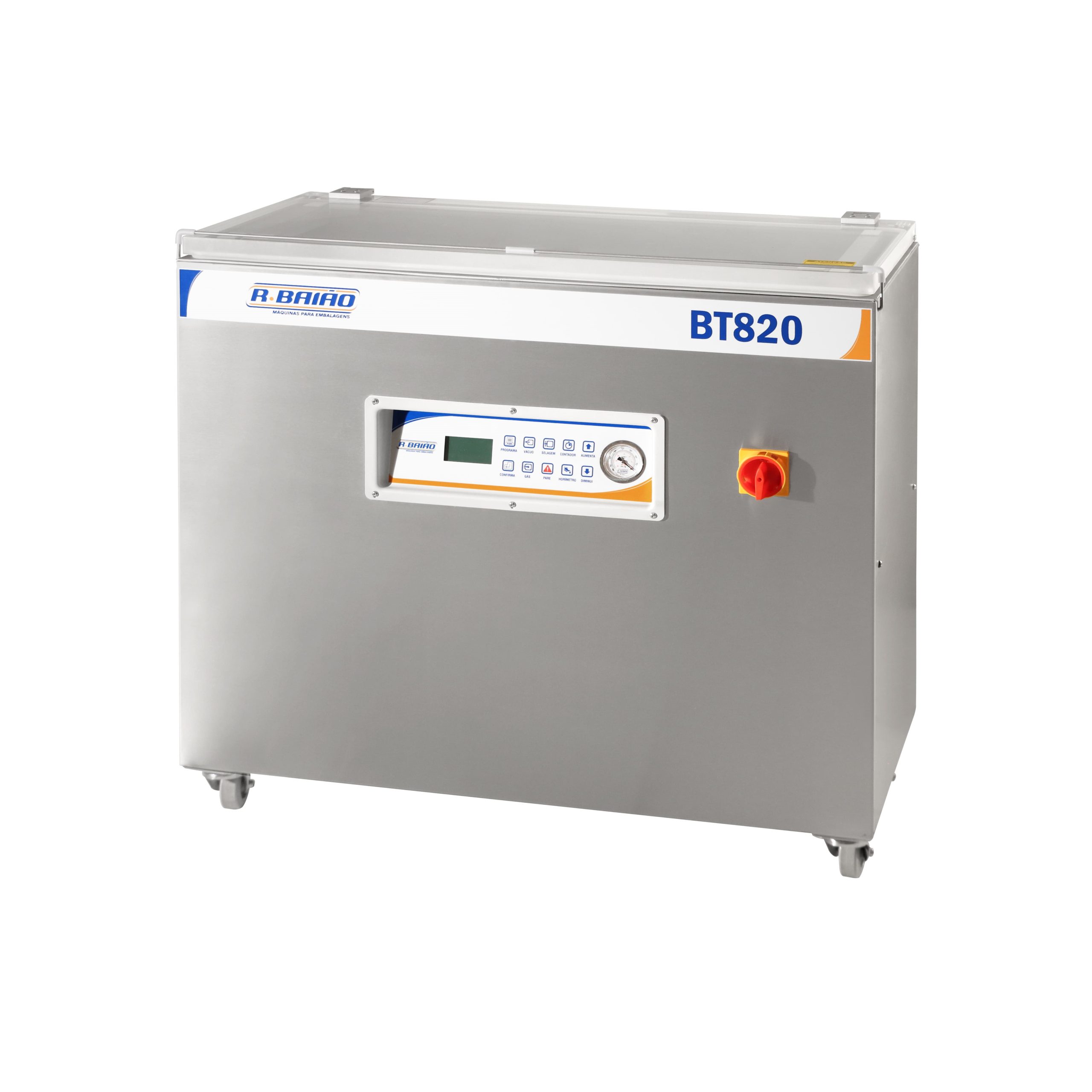 A Seladora a Vácuo de Câmara de Gabinete BT820 da R.Baião é construída em estrutura robusta de aço inox 304, com rodízios para facilitar a locomoção do equipamento. Tampa de acrílico de 30 milímetros, barra de selagem de fibra de vidro acionadas por cilindros, garantindo maior durabilidade. Possui painel digital com 15 programas, contador de processos, horímetro que indica o momento de trocar o óleo e botão “pare” para interromper o processo, caso seja necessário.